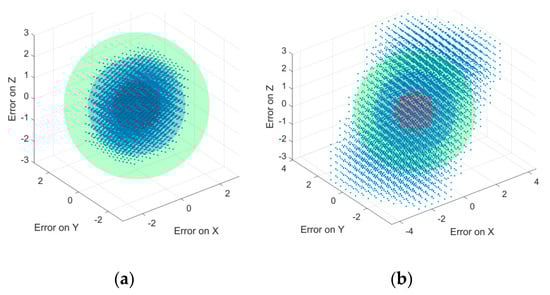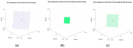 As previously stated, assuming a 1° angular error and 1 mm linear error results in (combined) errors of 2.5 mm and 5 mm at 50 mm depth and 200 mm depth, respectively (not taking into account any needle deflection) [], and according to [], these values are not acceptable for the targeted treatments. Figure 12 illustrates point clouds to show the error distribution for the mentioned values in Cartesian coordinates (where the points within the point clouds are not due to a random distribution but rather computed with incrementally numerical data for the input). To evaluate the accuracy of the gantry mechanism is straightforward since there is a one-to-one dependency between the Cartesian position of the RCM point and the values of the gantry mechanism actuators. Each actuator changes only one coordinate in the Cartesian space; therefore, the error in this case will be mainly due to the quality of the mechanical design of the gantry subsystem. An example of this error propagation is illustrated in Figure 13a, where a 0.7 mm error is assumed (due to high-resolution motors and 2° maximum backlash due to the gearheads) for the actuators of the gantry mechanism. These errors are, however, minimized by using the linear guides in the robotic system design (which are well calibrated). The results are different when the errors of the spherical mechanism are considered. Assuming a maximum ±2° (angular degrees) error as the actuator backlash (which is appropriated for gearheads nowadays—see, for example, gearheads from Maxon Motors []) the associated error (using belts and pulleys for the motion of the carriage on the circular guides, which inherently have no backlash) is approximately 0.34 mm (due to a radius of the rails of 200 mm). This, in turn, will translate to an angular error at the center of the sphere of about 0.076° (which, by using the similar triangle rule, may double at a 200 mm insertion depth). Figure 13 shows this error distribution at two insertion depths (100 mm and 200 mm), showing the accuracy of the HeRo parallel robotic system (e.g., at 200 mm depth, the error is less than 1 mm).