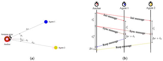 The ultra-wideband (UWB) signal can enable high-accuracy localization considering its following unique advantages [15]: (i) sub-nanosecond-level time stamps; (ii) strong resistance to MPCs; and (iii) high throughput and transfer rate [16,17,18,19]. Most UWB indoor localization systems are based on time-of-flight (ToF) and time-difference-of-arrival (TDOA) [20,21,22,23]. In such systems, many UWB transceivers, often called anchors, are applied to multiple corners of a scene to create a large coverage. Generally, three or four anchors can realize two-dimensional or three-dimensional localization of agents, respectively. The anchors allocate different time slots for different agents, and at each time slot they measure the ToF or TDOA from one agent and calculate the agent’s position via trilateration. This ToF- or TDOA-based localization method requires both high-cost system deployment and the exchange of a large number of messages, resulting in high system complexity and complicated message collision avoidance operations. Besides, the TDOA-based method requires strict clock synchronization between the anchors.