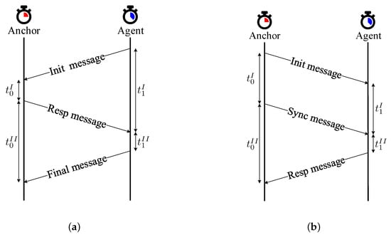 Comparison of two extended two-way ranging methods. (a) Traditional way of extended two-way ranging methods. (b) Improved way of extended two-way ranging methods.