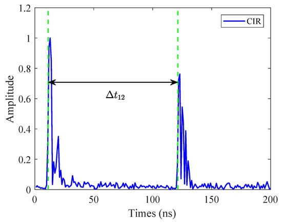 As shown in Figure 1b, the anchor broadcasts the first two messages to initiate the measurement process. In the payload of the Init message, the anchor writes the fixed time delay between the Init and Sync messages. The anchor also assigns a fixed delay to agent i and writes them into the payload. The purpose of introducing is to distinguish messages from different agents. Note that the capacity of the proposed SAL system is affected by , since represents an extra delay. However, MPCs may overlap with subsequent responses, which requires us to assgin larger delays and therefore limit the capacity of the system. In order to serve more agents in one waveform window with no waveform overlapping, we take the value of in tens of nanoseconds considering the general CIR register can receive a waveform with the period of 1016 nanoseconds [46]. An illustration of the received CIR is shown in Figure 3.