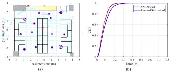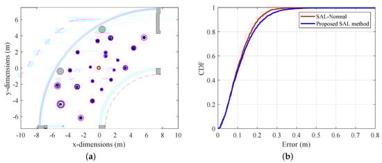 To quantify the overall localization performance of the system, we analyze the statistical characteristics of the localization error based on the CDF. Figure 5b shows the performance comparison when using SAL-Normal and the proposed SAL method with . When using SAL-Normal, the system can reach a 90% error of 20.6 cm and a median error of 10.3 cm. When using the proposed sal method, a 90% error and median error of 23.4 cm and 10.5 cm are achieved, respectively. The results show that the performance of the proposed method can almost reach the traditional method.