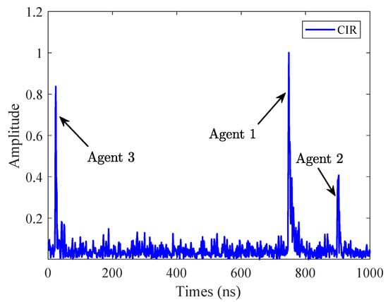 An illustration of the received CIR is shown in Figure 7. We randomly put three agents in the E1 environment (named Agent 1, Agent 2, and Agent 3, respectively), and set ns, ns, and ns, which means that Agent 2 will wait for an additional 150 ns before responding, and Agent 3 will wait for an additional 300 ns before responding. Note that the response of Agent 3 appears at the front of the CIR. This is because the CIR is the accumulation of the correlation results, and the part that exceeds the current window will be moved to the front [46].