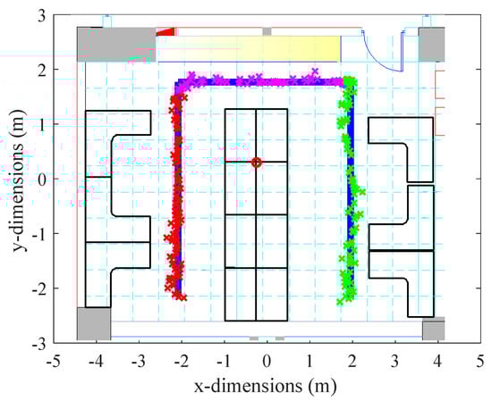In the previous experiment, we evaluated the agents’ localization performance at the selected test points. To further evaluate the performance of the localization system in a dynamic scenario, we let the agents move along a preset route in E2 (see Figure 8). In practice, we hold the UWB device and walk at a near-constant speed along the preset route. In addition, we make the agent and anchor close in height to better achieve two-dimensional localization. In the experiment, we employ three agents (agent 1, agent 2, and agent 3) as an example to evaluate the performance of our system. As shown in Figure 8, we let the three agents go straight along the three sides of the rectangle, respectively. The red circle represents the anchor, the semi-rectangular blue line is the preset route, the red cross sign is the tracking result of agent 1 starting from the left bottom, the magenta cross is the tracking result of agent 2 starting from the left top, and the green cross is the tracking result of agent 3 starting form the right top. The results show that the trajectory estimation of the three agents can well follow the preset route. Since it is not easy to relate the real-time position estimation to the ground truth, real-time localization errors cannot be counted. Note that the localization results are raw data, which means we do not use any filtering algorithms. The experimental results verify the potential of our system in practice application.