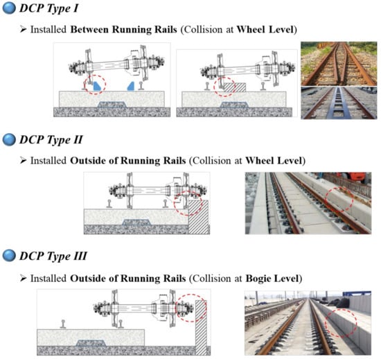 In European countries, three different types of derailment containment provisions (DCPs) are used (DCP types I, II, and III), as shown in Figure 2 []. The guard rail is one example of a DCP type I facility, where the DCP is installed inside the track gauge. The wheel of the derailed train comes into direct contact with the facility. DCP type II is similar to DCP type I, but is installed outside of the track gauge. DCP type III facilities are installed outside of the track, similar to DCP type II. However, they are different from DCP type II since the axis of the wheel or bogie of the derailed train impacts this type of DCP.