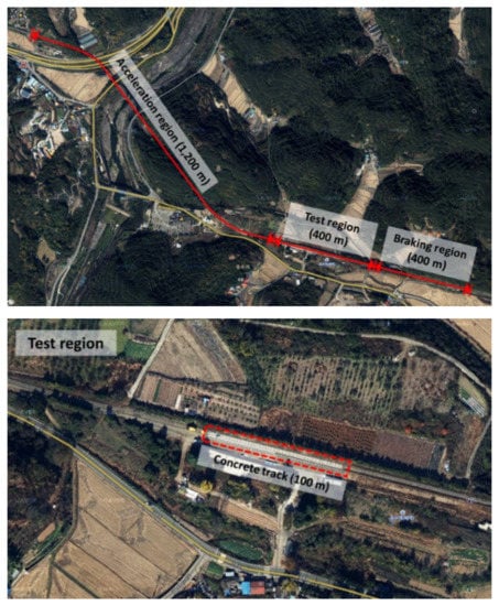 Full-scale train derailment testing requires a large test site. The test site consisted of acceleration, test, and braking regions, as shown in Figure 3. To increase the speed of the train at the point of derailment, a sufficient acceleration region is needed. Also, adequate test and braking regions should be provided to investigate the post-derailment behavior and to ensure safety, respectively. The lengths of the acceleration, test, and braking regions were 1200 m, 400 m, and 400 m, respectively. In the 400 m test region, a region of 100 m was used to construct a concrete track. The total length of the test line was about 2000 m. Once the target speed of the bogie is reached, a test bogie is released at the end of the acceleration region. The test bogie is derailed at the start of the test region and the post-derailment behavior is observed in the test region. A braking region is provided at the end of the test region. This is a margin region to provide safety after the unexpected behavior of derailed bogie or train. The derailment test site was constructed using a closed railway line to save on costs and replicate actual railway operating conditions.
