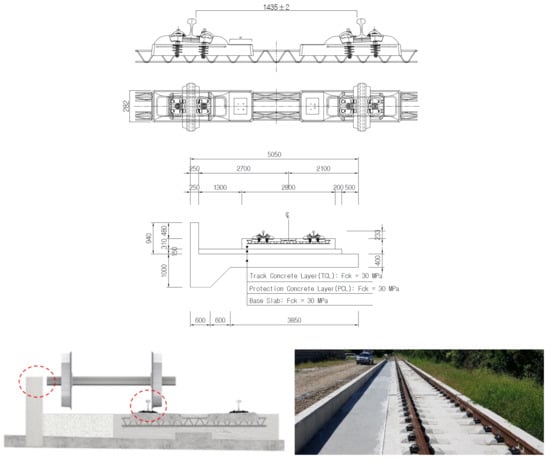 In this study, the focus was on the post-derailment behavior on a concrete track. A Rheda 2000 concrete track, shown in Figure 4, was constructed in the test region where the post-derailment behavior was observed. The Rheda 2000 concrete (ballastless) track was used for the first time in Germany in 2000 as a pilot project on the new rail line between Erfurt and Halle-Leipzig. It was also installed on the high-speed railway in Korea in 2004. Apart for this 100-m concrete track, ballast tracks were used. It should be noted that the derailment containment wall was installed on the left side of the track, as shown in Figure 4. The distance between the wall and the center of the track was 2700 m, considering the geometric condition of the axle of the test vehicle after the derailment.