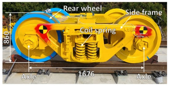 In this study, a bogie-level test was conducted. The bogie used in this study was a casting bogie for a freight train, as shown in Figure 5. The total weight of the test bogie was 40.91 kN and the specifications of the test bogie are listed in Table 1. The frame structure was made of three pieces of cast steel. The fixed wheel base and wheel diameter were 1676 mm and 860 mm, respectively. A suspension system with coil springs was used between the bolster and side frame.