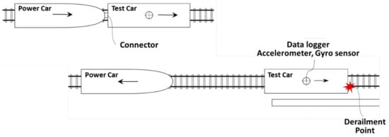 A device to induce derailment was needed for the test. Wheel-climbing derailment is one of the most frequent types of derailment. In this study, a derailment device that can induce wheel-climbing derailment was developed and installed at the derailment point, as shown in Figure 9 []. The device consisted of a wheel entrance part and a derailment part. In the wheel entrance part, there is an upward slope, and the entered wheel flange reaches the same height as the surface of a rail head. Then, the wheel climbs the surface of a rail head in the derailment part, shown in Figure 9c. Thus, the train or bogie is derailed due to wheel-climbing derailment.