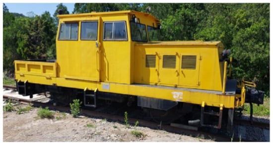 In order to accelerate the test bogie, several methods can be used, such as a reverse towing system, push system, or remote-controlled system. In this study, the push system shown in Figure 6 was used. The power car was linked to the test bogie with a connector. The test car was accelerated by the power car. Then, the test car was released after reaching the target speed. For this, the releasing system of the connector and braking system of the power car were designed to be controlled by air pressure and a remote controller, as shown in Figure 7. The power car used in this study is shown in Figure 8. The power car had a traction power of 147 kN.