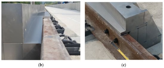 To reduce the damage from derailment accidents, protection facilities can be installed in the railway track. In Korea, guard rails to prevent derailment are used at sharp curves, bridges, and switches, as shown in Figure 1a. Containment walls are also installed on bridges for high-speed railways (where the minimum speed of the line is 200 km/h), as shown in Figure 1b [,,].
