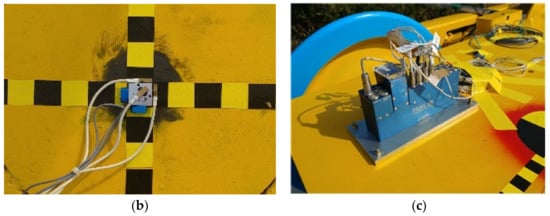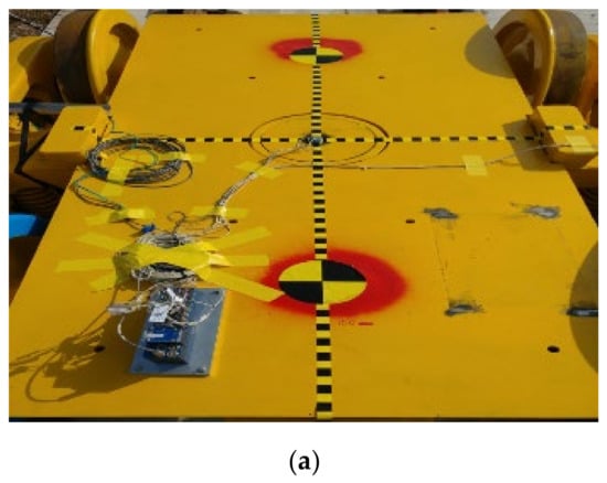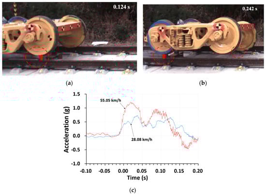 The position of the derailed train bogie and related data have to be accurately measured during the test. The acceleration and angular velocity of the bogie were measured. For this, an accelerometer and an angular velocity sensor were installed on the geometrical bogie center as shown in Figure 10b, where the capacities of the accelerometer and angular velocity sensor were 2000 g and ±1500 deg/s full-scale range, respectively. Large impact forces are expected after derailment. Thus, the sensors must be securely fixed to the test bogie. To measure the impact force, special accelerometers such as MEMS accelerometers [] can be used. However, it is hard to determine the exact impact point after derailment. Thus, the impact force to the rail was estimated from the acceleration data of the test bogie. A data logger was installed on the test bogie, as shown in Figure 10c. The data logger used was a shock-resistance data logger (high shock rating of 500 g) for collision testing and it has high sampling capabilities (max. sampling rate of 100 k samples/s/channel). The sampling rate of the data was 1/10,000 s (10,000 Hz) in this test.