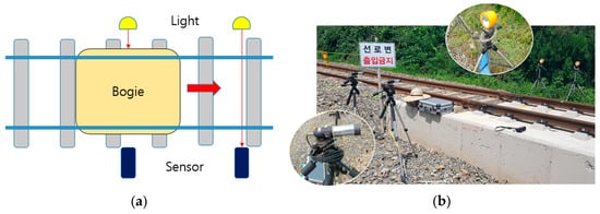 The velocity of the test bogie at the derailment point is important information for the analysis of post-derailment behavior. Since the test bogie was released before the derailment point, it was necessary to set up an additional velocity measurement system at the derailment point, as shown in Figure 11. In this study, a photoelectric tube speedometer was used. Two lights and two receiver sensors were installed at a specific distance. As the test bogie passes, the passing time between the two lights can be obtained. Then, the initial derailment velocity of the test bogie can be calculated.