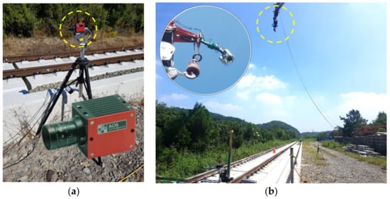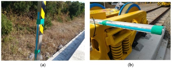 The tape switch method is simple and free from spurious operation. The trigger for the high-speed cameras was set up on the test track at the derailment point, as shown in Figure 13a. The trigger for the data logger, shown in Figure 13b, was installed on the test bogie. When the test bogie passes the derailment point, the trigger on the test bogie contacts the trigger for the high-speed camera. Then, data recoding is started. It should be noted that the trigger on the bogie was made of flexible materials since the post-derailment behavior could be affected by high stiffness and contact force between the triggers.