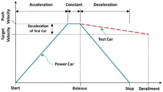 It was necessary to determine the running diagram of the power car and test bogie to achieve the target speed of the test bogie and to ensure the safety of the power car after releasing the test bogie. Figure 14 shows a schematic view of the running diagram of the power car and test bogie. The blue solid line and red dashed line represent the running diagrams of the power car and the test bogie, respectively. Before releasing the test bogie, the power car and the test bogie move together. The velocity at the release time is larger than the target speed. After releasing the test bogie, the power car reduces its speed and stops before the derailment point. The test bogie reaches the target velocity at the derailment point and is derailed.