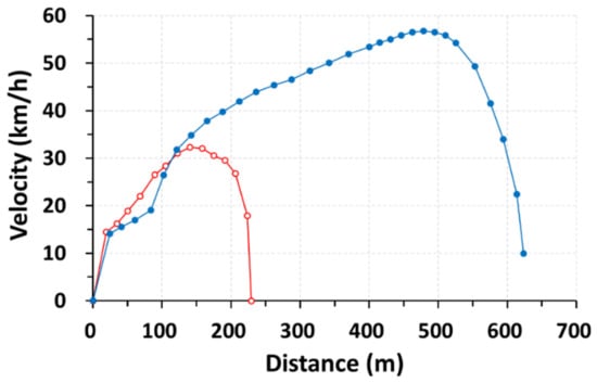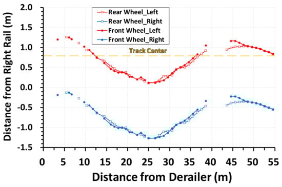 The distance to the release point depends on the target speed and acceleration capacity of the power car. The running diagram was constructed from the results of several preliminary tests. In this study, the target speeds of the test bogie were 30 km/h and 55 km/h. Figure 15 shows a representative running diagram of the power car through the preliminary tests. An acceleration distance of about 480 m was required for the stationary power car to accelerate to about 56 km/h, and a braking distance of about 150 m was required for subsequent stops. The deceleration to the derailment point after the release of the test bogie was approximately 1–2 km/h. Therefore, the running distance of the power car to ensure safety during the experiment with a target speed of 50 to 55 km/h was determined to be 650 m. In addition, an acceleration distance of about 140 m was required for the power car to accelerate to about 32 km/h, and a braking distance of about 90 m was required for subsequent stops. The deceleration to the derailment point after the release of the test bogie was approximately 2–3 km/h. Thus, the running distance of the power car to ensure safety with a target speed of 25 to 30 km/h was determined to be 250 m.