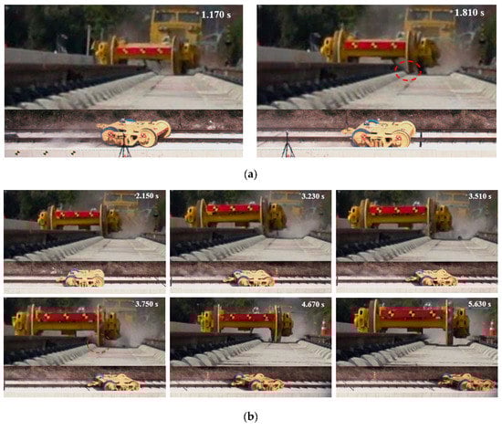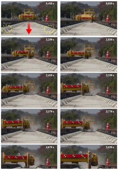 For Case #1, the target speed range was 25–30 km/h. The measured derailment velocity was 28.08 km/h. Figure 16 shows a front view of the post-derailment behavior in Case #1. It can be seen that the bogie ran in the right lateral direction after derailment (0.410–1.810 s), and the left wheel continuously contacted the hump of the concrete track (1.810–3.570 s). Then, the bogie moved to the left direction without contact between the right rail and left wheel (3.570–5.630 s). The direction was changed due to the effect of the hump in this case. In this study, the Rheda 2000 type concrete track was used, and the hump in this track affected the post-derailment behavior.