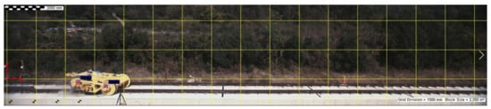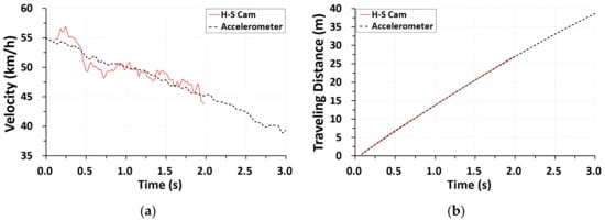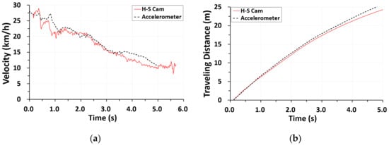 The acceleration data were analyzed to calculate the velocity and traveling distance of the test bogie. The analysis results were compared with the results obtained in the image data from the high-speed cameras for cross-validation of the data. It is known that the image analysis offers a certain potential for the dynamic investigation []. The velocity and traveling distance of the test bogie were also calculated by target mark tracking from the image data, as shown in Figure 17. The results are shown in Figure 18 as a solid line. It can be seen that the velocity obtained from the high-speed camera showed initial fluctuation. However, the overall trend of the velocity was similar to that from the accelerometer. The velocity decreased almost linearly, as shown in Figure 18a. The slope of Figure 18a represents the deceleration, and it was approximately −0.97 m/s2. By integrating the acceleration data twice, the traveling distance could be calculated, as shown in Figure 18b. The traveling distances obtained from the accelerometer and high-speed cameras were similar to each other. The discrepancy may come from accumulated error during the integration or distortion of the image by the use of a wide-angle lens.