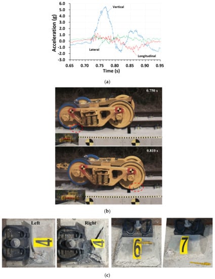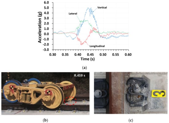 The longitudinal, lateral, and vertical acceleration data of the test bogie were analyzed with the video images together. The first impact was observed at 0.410 s after derailment, as shown in Figure 19. It can be seen that there were sudden changes in acceleration at the time of the first impact, as shown in Figure 19a. The maximum acceleration was found in the vertical direction, and it was 5.07 g (49.78 m/s2). If the total mass of the bogie is included in the calculation of the impact force, it is equivalent to approximately 207 kN of impact force. The first impact occurred between the left wheel and hump, as shown in Figure 19b. Figure 19c shows the damage to the hump and rail fastener due to the first impact.