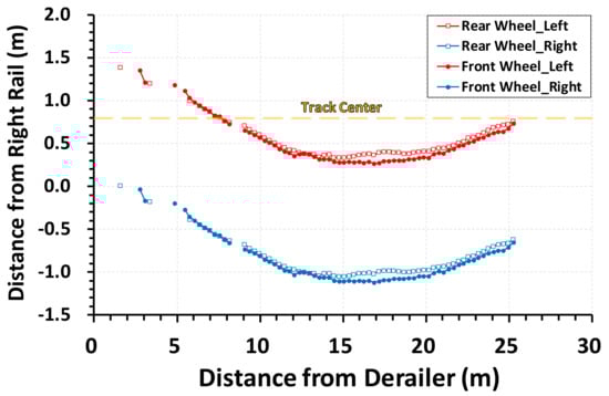 In summary, for Case #1, where the derailment velocity was 28.08 km/h, the derailed test bogie ran the track with considerable lateral movement. The lateral movement was restrained by contact with the humps in the concrete track. Then, the test bogie returned to the center of the track. The whole trace of the test bogie is shown in Figure 22. The maximum vertical acceleration was approximately 5.57 g at the second impact with the humps. The maximum lateral acceleration was approximately 2.62 g at the first impact with the humps. From the results, it can be seen that the effect of the humps on the post-derailment behavior was significant when the Rheda 2000 track system was used. Thus, the type of track must be considered when evaluating the post-derailment behavior of a derailed train.