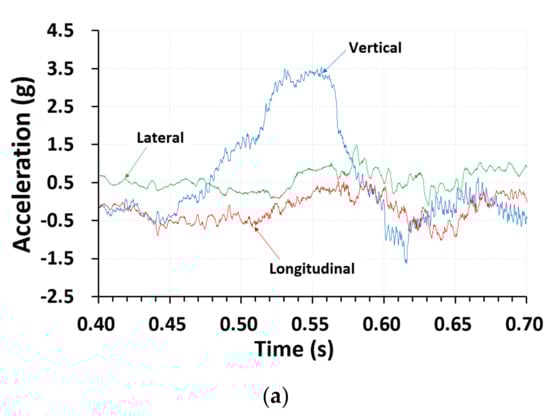 Similar to Figure 19, information about the second and third impacts is presented in Figure 20. The second and third impacts were observed at 0.750 s and 0.810 s, respectively. In the second impact, the right and left rear wheels impacted the fourth hump, as shown in Figure 20b,c. The maximum vertical acceleration was approximately 5.57 g—larger than that from the first impact. This may be attributed to the pitching moment of the bogie after the first impact. In the case of the third impact, the front right wheel contacted the sixth and seventh humps in succession. At the third impact, the peak of the vertical acceleration was markedly decreased.