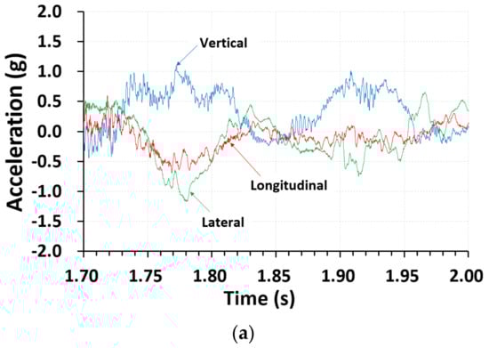 The main impact to the track was observed around from 0.4 s to 0.7 s, as shown in Figure 25. At 0.460 s, the front right wheel came into contact with the eighth rail fastener. Then, the front right wheel impacted the ninth hump and the rear right wheel immediately came into contact with the seventh rail fastener. The maximum vertical acceleration was found at this time, and it was approximately 3.53 g. The maximum acceleration in Case #2 was smaller than that in Case #1. This is because increased velocity is related with the longitudinal direction and vertical impact force is mainly a function of the velocity in the vertical direction.