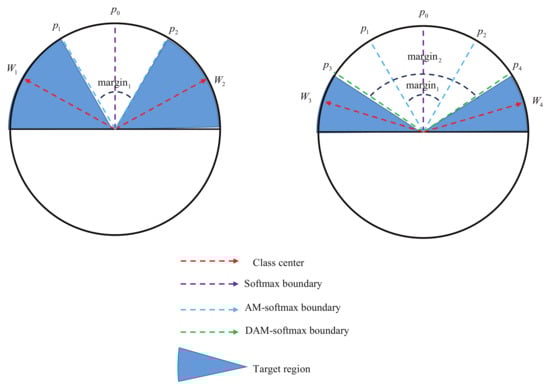 Classification Stringency. In order to correctly classify the learned feature vector as class 1, the traditional softmax loss requires which easily has , the AM-Softmax loss requires which can be rewriten as , while our DAM-Softmax loss needs which can be reformulated into . It is obvious to see that the DAM-Softmax loss is more stringent than the orginal softmax loss and AM-Softmax loss for satisfying the corresponding classification criteria.