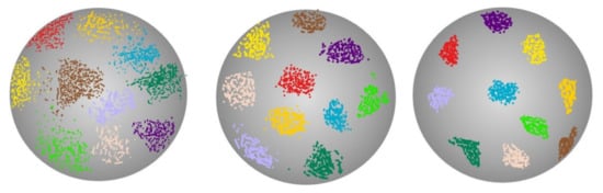 Due to the fact that few existing softmax losses can effectively achieve the discriminative condition that the maximal within-class variance is less than the minimal between-class variance under the conventional Euclidean metric space, more recently, approaches have been proposed to address this problem by transforming the original Euclidean space of features to an corresponding angular space [,,,]. Specifically, both Large-Margin Softmax Loss [] and A-Softmax Loss [] are an angular softmax loss that enables DCNNs to learn angular deep features by imposing an angular margin constraint for larger inter-class variance. Compared to the Euclidean margin suggested by [,], the learnt angular features is more discriminative with the angular margin because the angular metric with cosine similarity is intrinsically more suitable to the softmax loss. During training of A-Softmax Loss, the orginal Softmax loss must be combined to ensure the convergence. To overcome the optimisation problem of A-Softmax Loss, the Additive Margin Softmax loass (AM-Softmax) [] is proposed. The loss integrates a angular margin to the softmax loss in an additve manner. Its implementation and optimisation are much easier than A-Softmax Loss since A-Softmax Loss integrates the angular margin in a multiplicative way. AM-Softmax is easily reproducible and achieves state-of-the-art performance.