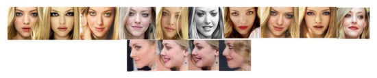 - Sengupta, S.; Chen, J.C.; Castillo, C.; Patel, V.M.; Chellappa, R.; Jacobs, D.W. Frontal to profile face verification in the wild. In Proceedings of the 2016 IEEE Winter Conference on Applications of Computer Vision (WACV). IEEE, Lake Placid, NY, USA, 7–9 March 2016; pp. 1–9. [Google Scholar]