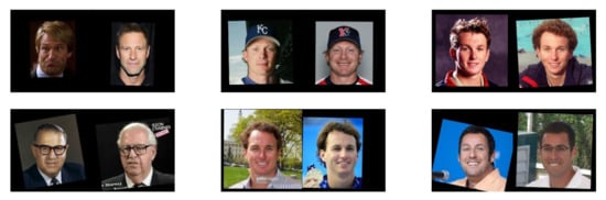 Test Datasets. LFW dataset [] contains 13,233 web-collected images from 5749 different identities, with large variations in pose, expression and illuminations. CFP dataset [] consists of 500 subjects, each with 10 frontal and 4 profile images. The evaluation protocol includes frontal-frontal (FF) and frontal-profile (FP) face verification, each having 10 folders with 350 same-person pairs and 350 different-person pairs. In our experiments, we employ to test the performance the most challenging subsets CFP-FP which contains images of celebrities in frontal and profile views, CPLFW [] and CALFW [] which have higher pose and age variations with same identities from LFW dataset. Specific details of the three datasets above are shown in Table 1 and some example images from CFP-FP, CPLFW and CALFW are given in Figure 3, Figure 4 and Figure 5, respectively.