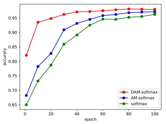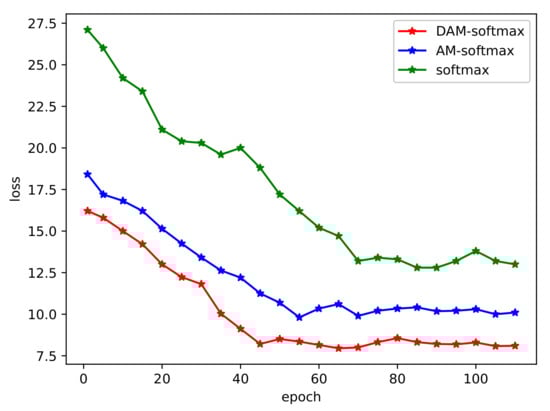 From Figure 6, It can be seen that the verification accuracy of DAM-Softmax loss is over 80% after one epoch while AM-Softmax loss requires 20 epoches to achieve the similar accuracy. In the 40th epoch, DAM-Softmax loss reaches the best performance which is still superior to the one of AM-Softmax loss. Figure 7 reports the training loss under the variation of epoch. When epoch = 75, the training loss of the original Softmax loss approaches stabilization with the value of about 13 by using softmax, the AM-softmax’s training loss reach stabilization at around 10 when epoch is 55, while DAM-softmax get to stabilization at the 40th epoch and has a lower training loss. Therefore, This can demonstrate that the proposed loss has a faster convergence speed than AM-Softmax loss. As can be seen in Table 4, our proposed DAM-Softmax loss consistently arrives at competitive results compared to the other losses, which demonstrates the effectiveness of DAM-Softmax loss.
