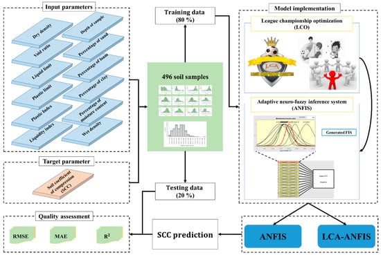 More recently, hybrid swarm science has been broadly used in various geotechnical engineering issues (e.g., landslide modeling) for prevailing the computational shortcomings of regular data mining techniques [8,17]. For the purpose of SCC estimation, multi-gene genetic programming was used by Mohammadzadeh, et al. [18] for compression index modeling of fine-grained soil. The results of the proposed technique found to be more promising than traditional models. In another application of hybrid algorithms by Bui, et al. [19], particle swarm optimization (PSO) was synthesized with ANN to forecast the SCC of an urban project in Vietnam. Referring to the correlation criteria of 0.884 and 0.862 respectively for the testing phase, it was shown that the PSO is capable enough to improve the performance of ANN. As is seen, hybrid science has not sufficiently served in this field, and also, previous studies have mainly employed common optimization techniques like the GA and PSO for ANNs. Hence, in this paper, we introduced a new hybrid of ANFIS, namely, league championship optimization (LCA) used for estimating the SCC from a real-world project data. More specifically, the main contribution of the LCA algorithm lies in the adjustment of ANFIS membership function parameters. The results of both typical and reinforced ANFISs are evaluated to examine the effect of the applied hybridization.