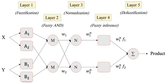 Among various fuzzy inference methods, Mamdani, Takagi–Sugeno, and Tsukamoto fuzzy are three notable ones that are commonly used to develop an ANFIS [31]. Figure 2 shows the structure of a Takagi–Sugeno FIS consisting of two inputs flowing within five layers. The membership function (MF) values of each input variable are calculated in the first layer nodes: