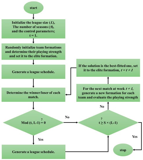 The number of seasons (S) is a termination factor comprising L-1 weeks (repetitions) which yields S × (L-1) contest weeks (Note that L is an even value). Considering the league schedule in every week, the existing teams play in pairs. Based on the formation of the team, the team’s playing strength determines the outcome of the match. Each team aims to update its formation during the recovery time when it is tracking the events of the previous events [34]. The flowchart of the LCA is schematically presented in Figure 3.