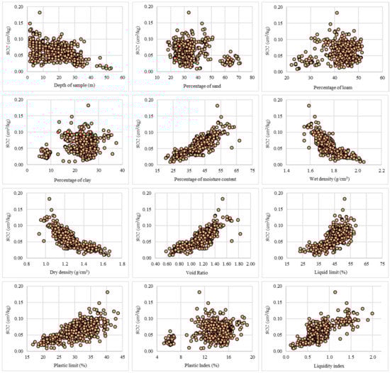 Eventually, the coefficient of compression is considered as the target variable affected by twelve key factors of soil, including depth of sample (DOP), percentage of sand, percentage of loam, percentage of clay, percentage of moisture content (MC), wet density (WD), dry density (DD), void ratio (VR), liquid limit (LL), plastic limit (PL), plastic Index (PI), and liquidity index (LI) as independent variables. Figure 5 depicts the SCC versus the mentioned factors. Moreover, descriptive statistics are available in Table 1.
