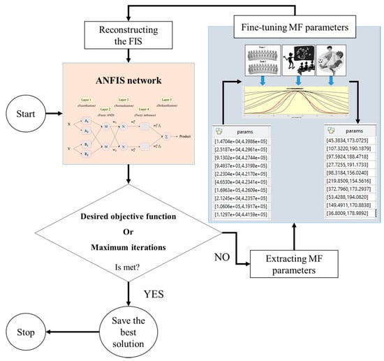 Utilizing the programming language of MATLAB 2014 (MathWorks, Natick, Massachusetts, USA), the LCA algorithm was coupled with ANFIS. Here, the main role of the metaheuristic algorithms is to adjust the parameters of the MFs [36]. This process is depicted in Figure 6. The FIS is reconstructed each time using new parameters. Note that, Gaussian membership function was used for ANFIS.