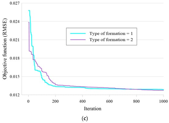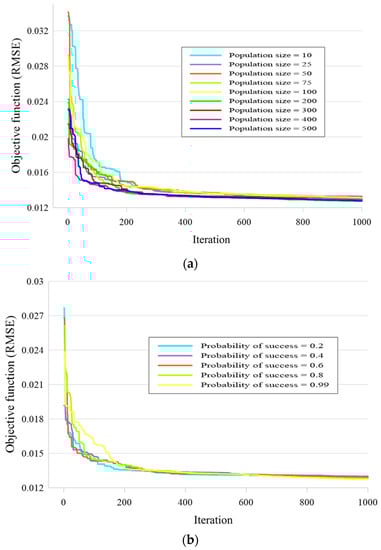 Next, five POSs of 0.2, 0.4, 0.6, 0.8, and 0.99 were tested, where the population size and TOF were 200 and 2, respectively. the convergence curves are presented in Figure 7b. The behavior of the models was similar to Figure 7a, and the lowest RMSE was equal to previous value as the best structure was created by POS = 0.99.