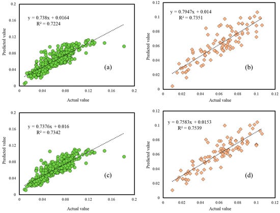 The correlation between the actual and predicted SCC in the training and testing phases of (a,b) ANFIS, (c,d) LCA-ANFIS.