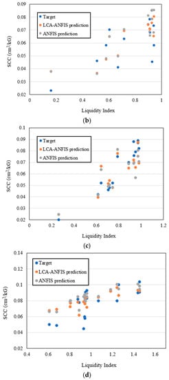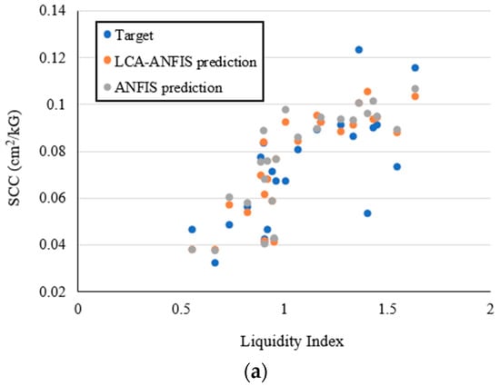 Another appreciable point is that the performance of both models for the testing data was more accurate than training ones. It could be also derived by the calculated values of the RMSE and MAE. Due to the extent of data, a possible reason for that could be the wider range of data in the training set (the difference between the maximum and minimum values of SCC is 0.173 and 0.096, respectively for the training and testing data). As Figure 10a,c illustrate, two maximum values of training dataset are 0.182 and 0.148 which have been considerably underestimated as 0.0969 and 0.1052 by ANFIS and 0.0926 and 0.1070 by LCA-ANFIS, respectively.