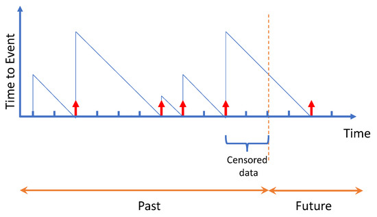 Yet another problem that arises in both of these labeling methods is the censoring. Let’s consider the TTE labeling scheme. Measurements logged after the last failure cannot be assigned a label, because we do not know in advance when the next failure is going to happen. There is some research on how to make use of these censored part of the data [20,21]. However, in this work we have decided to neglect these censored part for the sake of simplicity, since we have enough labelled data. Both TTE labeling and censored data concept are shown in Figure 1.