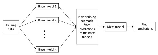 Stacking in its original form is a two-layer architecture. Based on Wolpert terminology [31], first layer data and models are referred as “base” data and models respectively, and second layer cross-validated data and models are referred as “meta” data and models respectively. Stacking is categorized as parallel architecture since base models can be trained independently from each other. The basic architecture of stacking can be shown pictorially using the following diagram (Figure 5).
