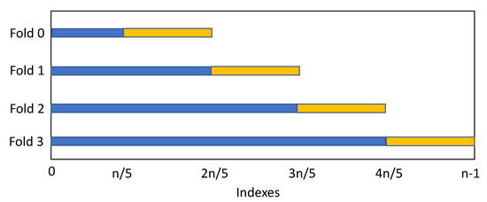 However, since our data has a time series nature to it, we cannot simply use the standard k-fold cross validation, because if we did, we would end up using the future to predict the past. To tackle this problem we adopt a time-based cross validation in which the data folds that a model is trained on, always have lower indexes than the data folds chosen for making predictions. The time-based cross validation is depicted in Figure 6. Notice that data with index in range [0,n/5] cannot be used in training the meta model since it can cause overfitting.