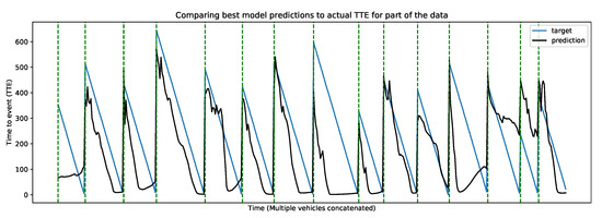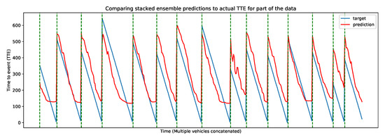 Figure 8 and Figure 9 show the prediction of stacked ensemble predictions and best model prediction against target values, respectively. As can be seen in Figure 9, predictions of the best model generally drop too early in comparison to the target TTE. Also, it can be seen that there are more unnecessary fluctuations in its predictions. On the other hand, the stacked ensemble predictions drop much closer to the target TTE, with not nearly as much fluctuation.