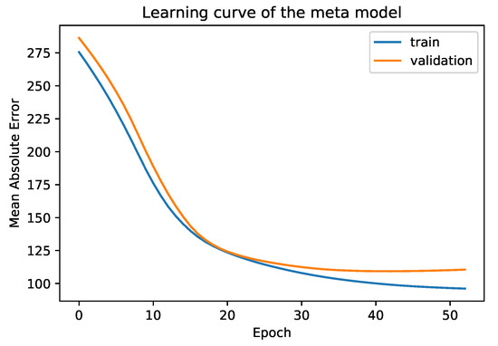 Please note that for both learning curves early stopping is applied (early stopping epoch for best base model is 63 and for meta model is 43). The error on both validation and training sets is lower for meta model, except at the beginning of the curves for the training set. The reason for the error of the base model being lower at the beginning for the training set is that mini-batch training is used for base models, but incremental training is used for meta model. It can also be seen that the evolution of the meta model error is much more stable in comparison to the base model.