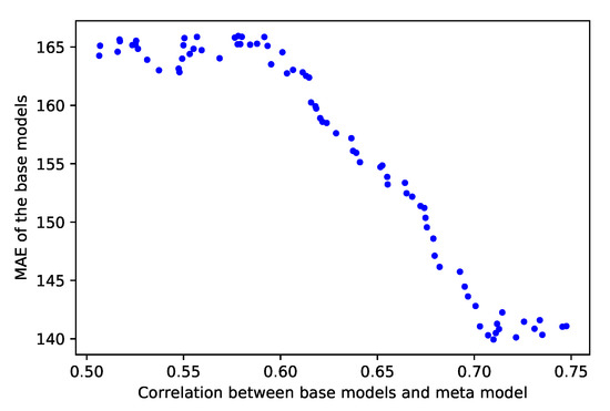 In Figure 12 we present how the correlation between base models and the meta model is related to the performance of the former. It can be seen that for base models with between 0.5 and 0.6 correlation to the meta model, the MAE values are almost steady (with only minor fluctuations). After that, as the correlation increases the MAE reduces until the correlation reaches to almost 0.7. From this point on, the MAE values seem to remain steady again. Decrease in MAE as the correlation increases is expected since the meta model is predicting target values; hence, higher correlation between the base models and the meta model means higher predictability and consequently lower MAE.