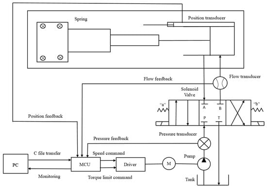 Figure 1 and Figure 2 presents a schematic illustration of the experimental system constructed in the present study. The micro control unit, as known as MCU, is produced by ICP DAS company with 1 kHz sampling rate, seven channels to install analog I/O, digital I/O modules. The driver which had a 20-bits resolution encoder is produced by the DELTA company. The servo motor is a permanent-magnetic motor produced by DELTA company, and its power is 5.5 kW with a maximum motor speed of 3000 rpm. The power source in the experiment system was a piston pump from the YEOSHE company with the highest pump speed is 2750 rpm. Additionally, the continuous working pressure and displacement of the pump were respectively 350 bar and 16 cc/rev. More details of main components’ specifications are listed in Table 1.