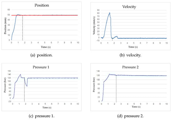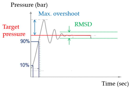 The maximum overshoot was defined as the difference between the maximum recorded pressure value and the target pressure value. Meanwhile, the response time was defined as the time taken for the cylinder to move backward to the second target position having first reached the V–P switchover position. Finally, the standard deviation (RMSD) of the pressure was defined as the magnitude of the pressure variation between the system pressure and the target pressure under steady-state conditions.