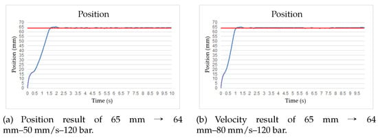Figure 9 demonstrates the results of the multi-positions control, the red lines stand for the second target position. The slope indicates the moving forward speed of the hydraulic cylinder, which is positively correlated with the target velocity (Figure 9a,b). The maximum overshoot of the position occurs right before the V–P transition, then the position holds at the second target position steadily.