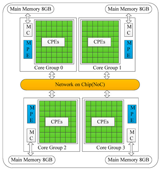 The Sunway TaihuLight supercomputer was developed by the National Parallel Computer Engineering Technology Research Center. Each computer node contains a SW26010 heterogeneous many-core processor. Each processor is composed of four core groups (CGs), as illustrated in Figure 1. Each CG contains an MPE for latency-sensitive tasks and a CPE cluster of 64 CPEs that are organized as an 8 × 8 mesh for throughput-sensitive tasks.