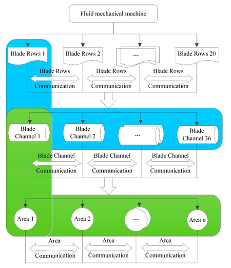 Parallel hierarchy of the axial compressor rotor. Large fluid machinery has a physical structure that consists of multiplexers, multiblade rows, multiblade channels, and multi-regions.