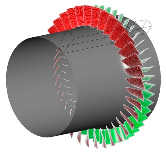 Large fluid machinery has a physical structure that consists of multiplexers, multiblade rows, multiblade channels, and multi-regions [24]. Correspondingly, it is necessary to communicate the boundary data between blade rows when designing simulations. In addition, blade channel boundary and regional boundary communication are required, as illustrated in Figure 2. In order to illustrate the blade row and blade channel, the geometric model of the axial compressor is shown in Figure 3, in which red blades represent rotor blades, green blades are stator blades, and the polygon stands for the blade channel. The blade channel can be divided into blade regions. The full circle is the blade row.